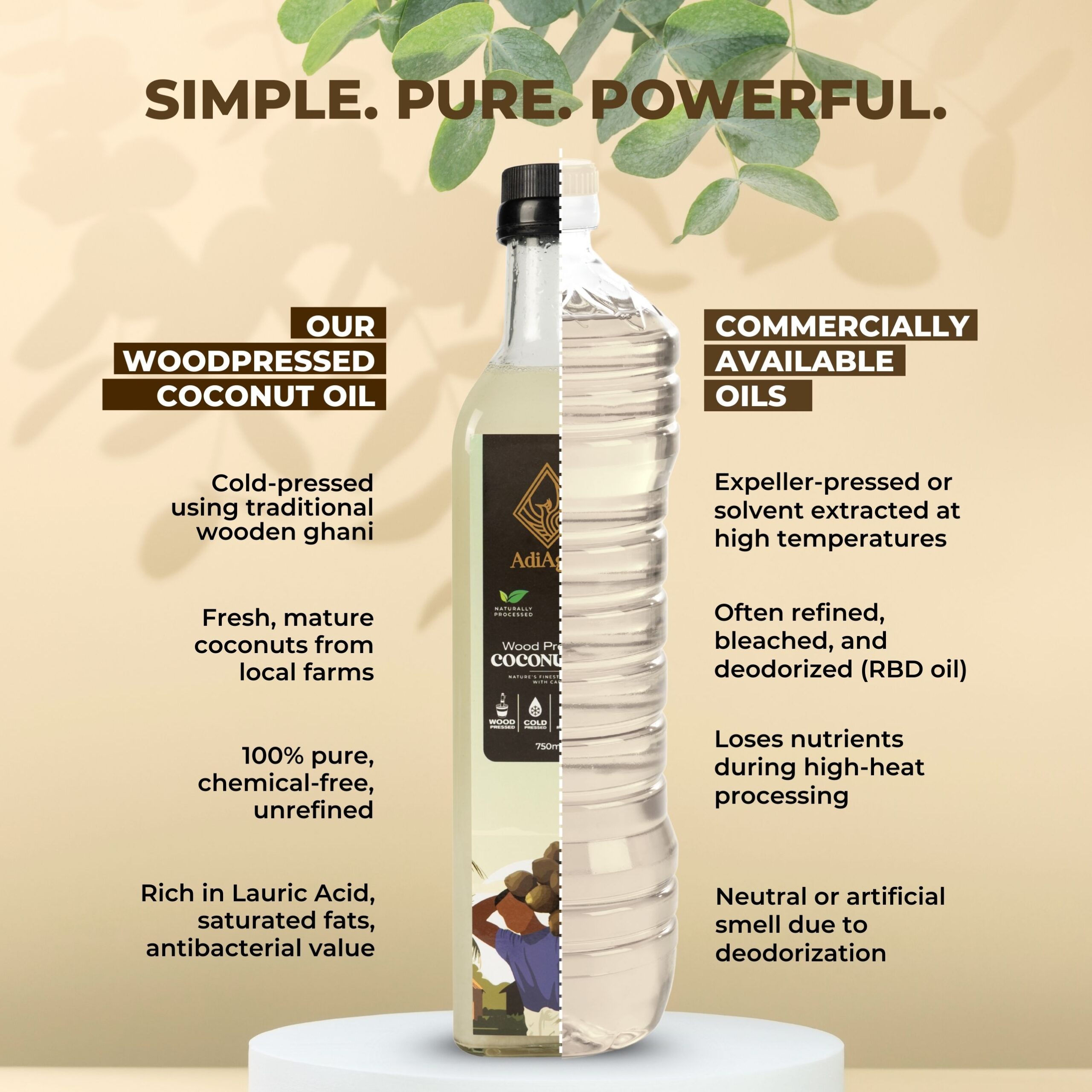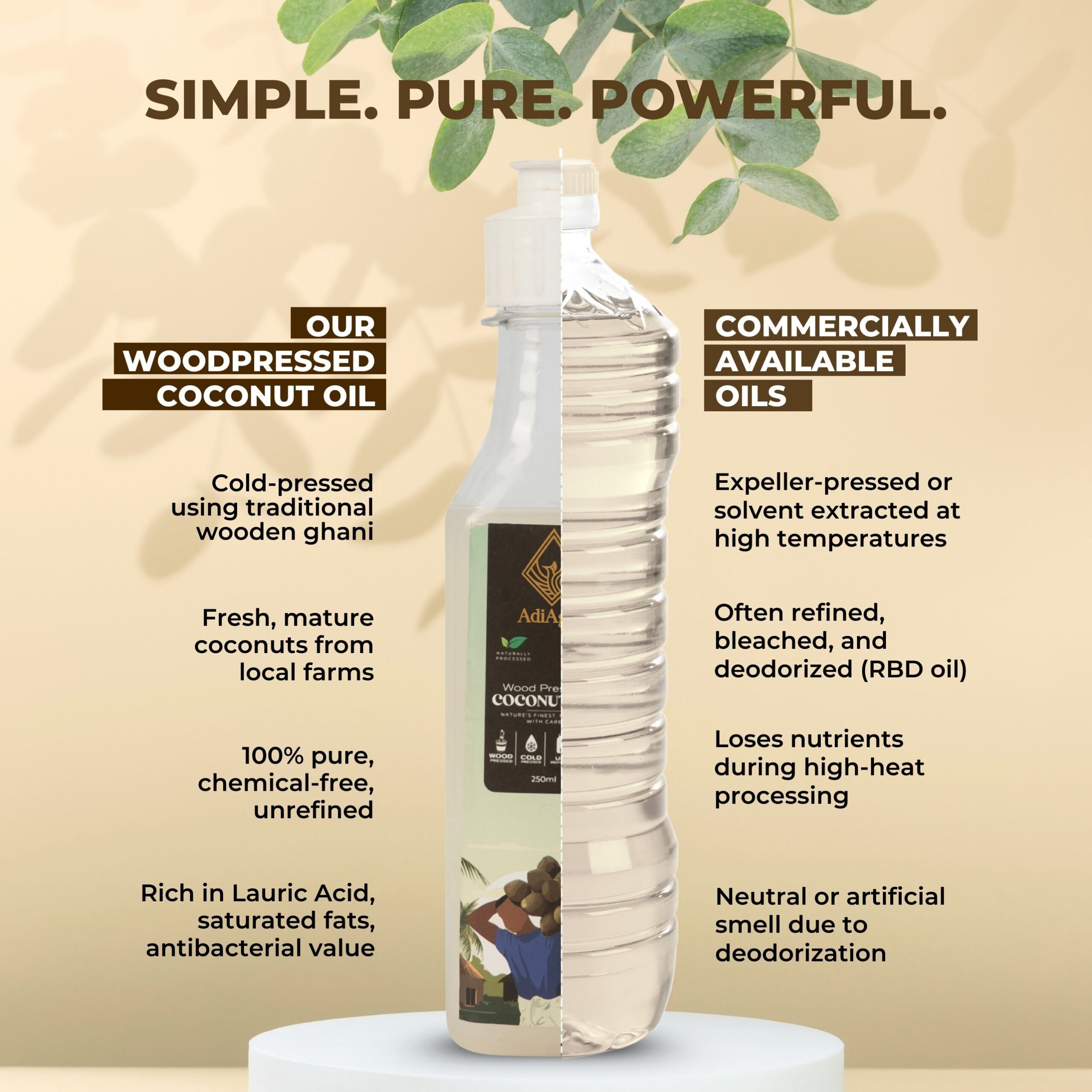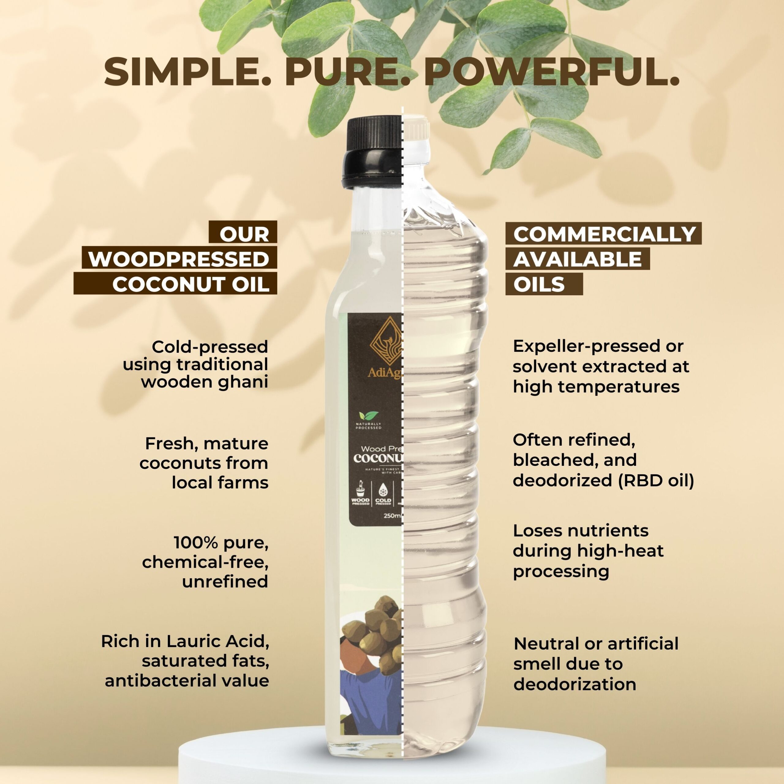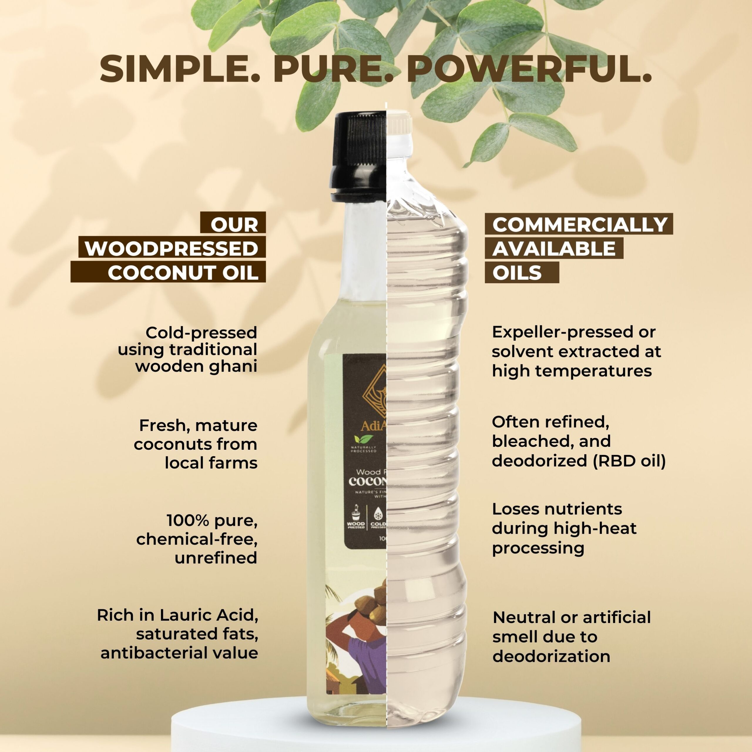 Using the ancient Cold-pressed techniques, oil is extracted from Wooden Ghani at very low RPM (Rotations per minute). As very low heat is generated in extraction process, all nutrient contents are intact and not burned away. Coconut Oil is extracted from Coconut Drupes or fruits.